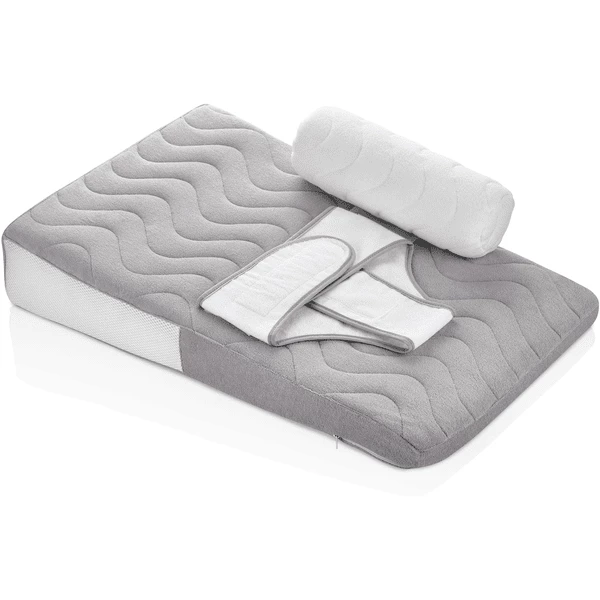 Otticamente, questo ricorda babyJem Cuscino a reflusso in grigio su alzata materasso o su un grande cuscino a cuneo. In linea di principio, questo è esattamente ciò che è: il grande cuscino in schiuma rigida a forma di cuneo ha un’inclinazione di 15 gradi. I bambini che ci dormono sopra sono leggermente cresciuti. Questo per evitare che l’acido dello stomaco o il contenuto dello stomaco ritorni nell’esofago. Inoltre, il cuscino speciale ha due cuscini più piccoli a forma di cuneo che vengono utilizzati sul lato sinistro e destro del bambino.