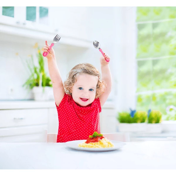 Il cucchiaio ha i bordi arrotondati e la forchetta ha i denti smussati. Con
