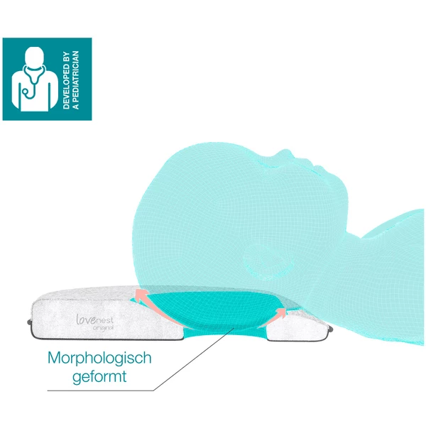 Il cuscino per neonati brevettato Lovenest impedisce la deformazione della parte posteriore della testa del bambino causata dalla posizione supina. La sua particolare inclinazione e la sua particolare forma proteggono la forma del cranio del bambino, che è molto più allungata di quella di un adulto, e garantiscono una distribuzione uniforme della pressione sul cranio del bambino.