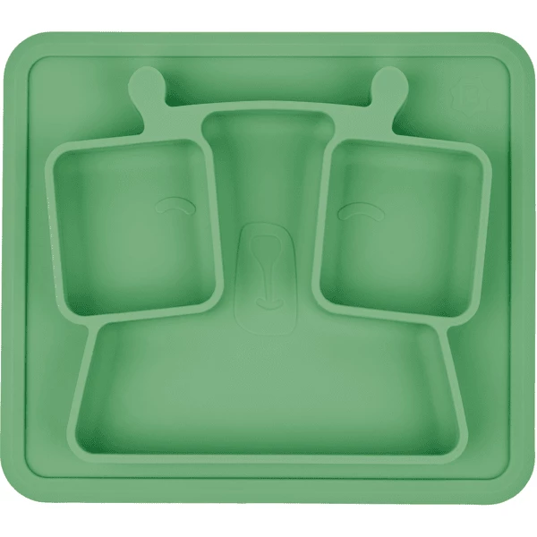 La piastra di apprendimento è realizzata in silicone antiscivolo ed è dotata di una ventosa aggiuntiva per una maggiore stabilità. I bordi arrotondati consentono al bambino di afferrare facilmente il cibo sia con le dita che con le posate.