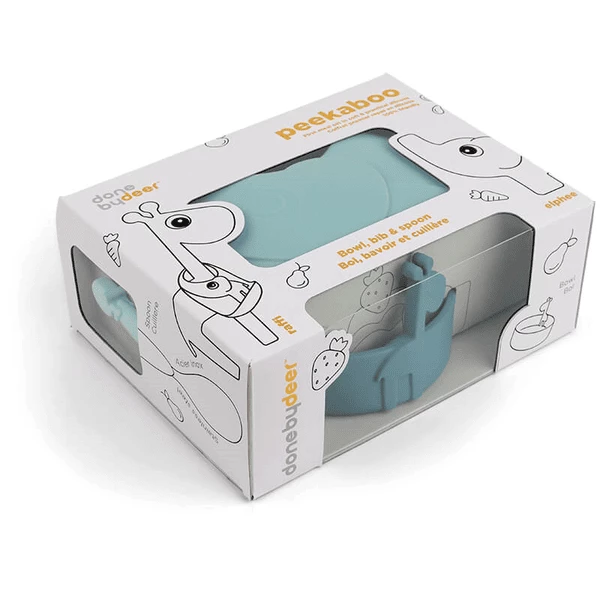 Il set “Peekaboo” per la prima pappa è pensato per risvegliare la curiosità dei piccoli mangiatori. Elphee e Raffi fanno capolino dai piatti, rendendo il momento del pasto un momento ancora più divertente della giornata. Un set perfetto per le prime pappe e per imparare a nutrirsi da soli. La simpatica ciotola, il cucchiaio e il pratico bavaglino sono realizzati in silicone alimentare, che rende il set infrangibile e adatto al microonde, oltre ad avere proprietà antiscivolo e anti-scivolo. Il set presenta dettagli pratici che supportano l’alimentazione. I più piccoli si divertiranno ad avere con sé i divertenti animali quando mangiano: lasciate che la borsa di Elphee catturi il cibo che si perde e che Raffi li incoraggi a raggiungere l’emozionante traguardo di mangiare da soli. Il simpatico set regalo è realizzato in morbide tonalità di blu.