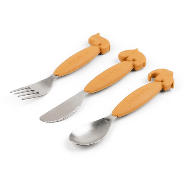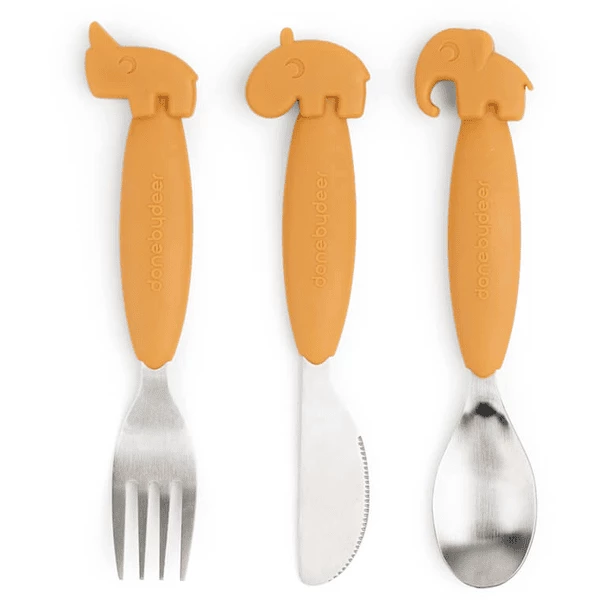Il coltello Ozzo, la forchetta Nozo e il cucchiaio Elphee in giallo senape rendono il mangiare da soli davvero divertente! Il colore giallo senape si abbina perfettamente al resto della collezione di stoviglie di Done by Deer .