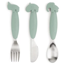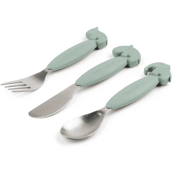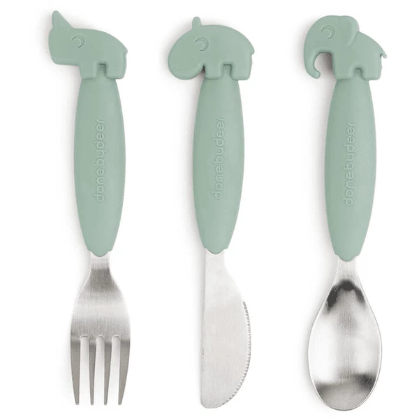 Il coltello Ozzo, la forchetta Nozo e il cucchiaio Elphee in verde rendono il mangiare da soli davvero divertente! Il colore verde si abbina perfettamente al resto della collezione di stoviglie di Done by Deer .
