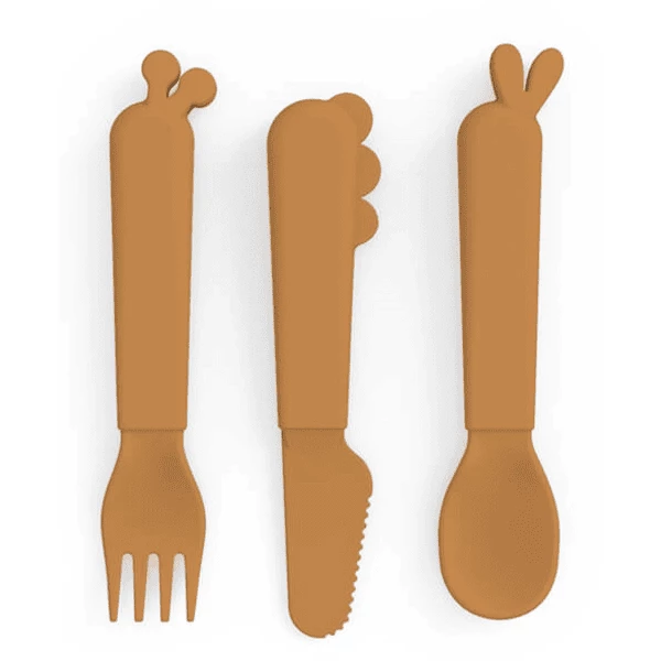 Questo grazioso set di posate giallo senape è composto da un cucchiaio con orecchie Lalee, una forchetta con orecchie Raffi e un coltello con scaglie Croco. Ha una finitura opaca e si abbina perfettamente al resto della collezione Kiddish.