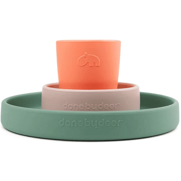 Il piatto verde Croco, la ciotola rosa con anguria e la mini tazza in un insolito rosso corallo fanno di questo set da tavola una splendida idea regalo.