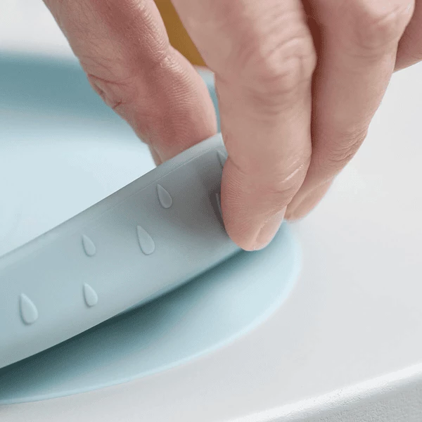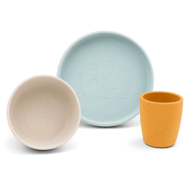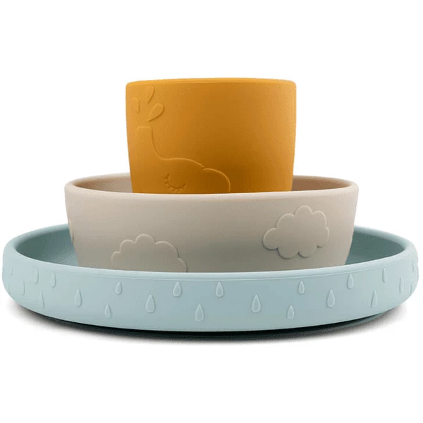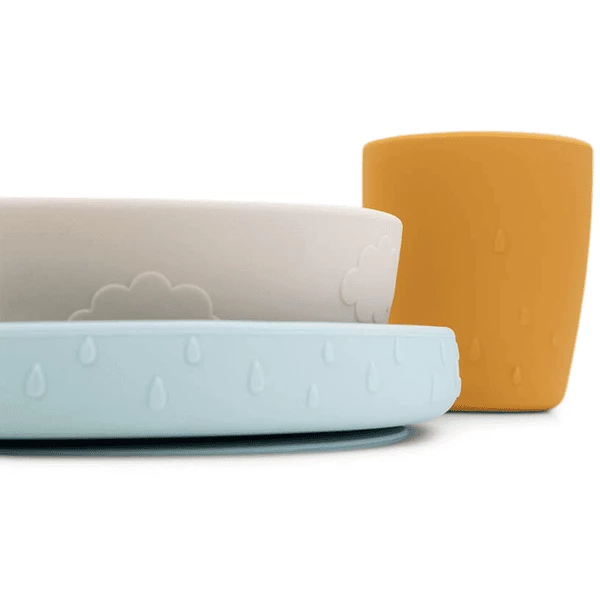 Il piatto blu, la ciotola beige sand e la mini tazza giallo senape presentano Elphee, Raffi, Birdee, gocce d’acqua e nuvole da sogno. Con una leggera pressione, il piatto e la ciotola si attaccano alla maggior parte delle superfici lisce. In questo modo si evita che il bambino si muova, si ribalti o li lanci.