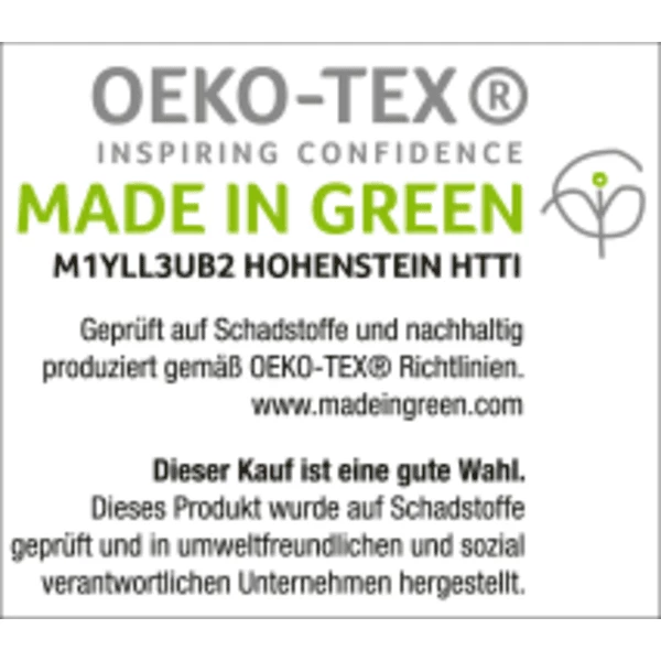 - Certificato secondo lo STANDARD 100 da OEKO-TEX®: 97.T.1067 HOHENSTEIN HTTI