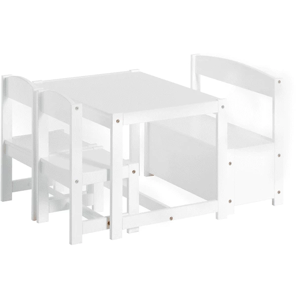è di 4 pezzi e consiste in un tavolo, 2 sedie e una cassapanca con spazio di