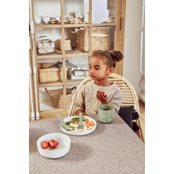 - Grazie alle loro dimensioni compatte, la forchetta e il cucchiaio aiutano i più piccoli a imparare a mangiare in modo indipendente.