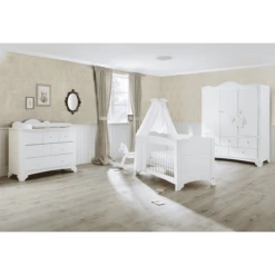 Una cameretta composta da 3 pezzi: lettino per bambini con doghe e pannelli laterali, fasciatoio con base per il cambio rimovibile e armadio a 3 ante con 4 ripiani regolabili in altezza, 1 asta appendiabiti e 2 cassetti con divisori.