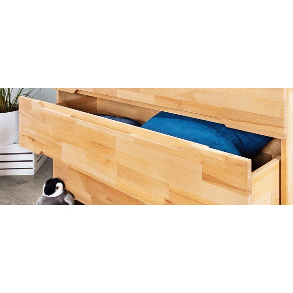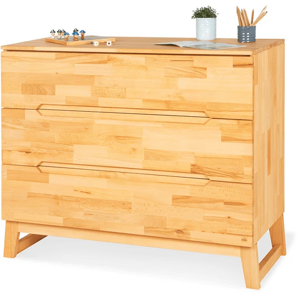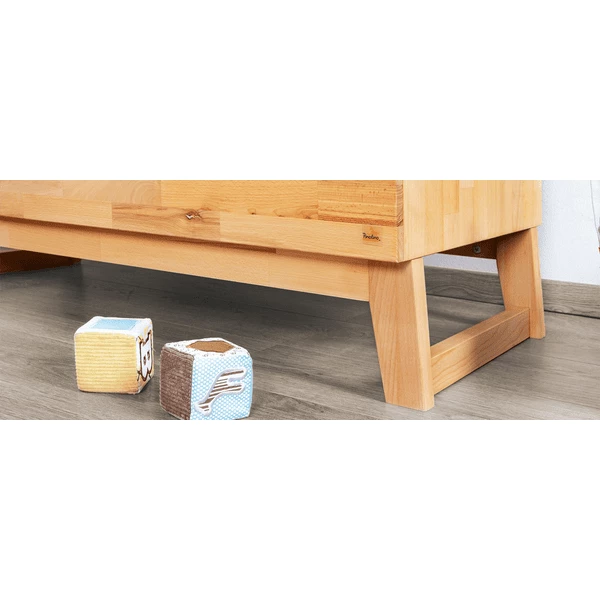 La struttura in legno chiaramente visibile e le impugnature fresate incassate sono un vero e proprio eye-catcher in ogni vivaio. Il fasciatoio può essere montato a sinistra, a destra o al centro, oppure può essere rimosso completamente per creare un lato alla moda board . L’ampia costruzione e i tre grandi cassetti aden forniscono abbastanza spazio per pannolini, prodotti per la cura e altri accessori. Dopo il cambio del pannolino, vi si possono riporre anche magliette, pantaloni o maglioni. I cassetti sono dotati del collaudato sistema Self-Soft-Close, che permette loro di chiudersi in modo sicuro e silenzioso. Le dita dei bambini piccoli sono anche protette da brutti lividi quando aiutano a mettere fuori gli utensili per il cambio del pannolino.