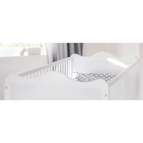 Composta da 2 pezzi: lettino con doghe e pannelli laterali, fasciatoio XL con superficie per il cambio rimovibile e mensola. La culla può essere facilmente convertita in letto junior in un secondo momento con i pannelli laterali.