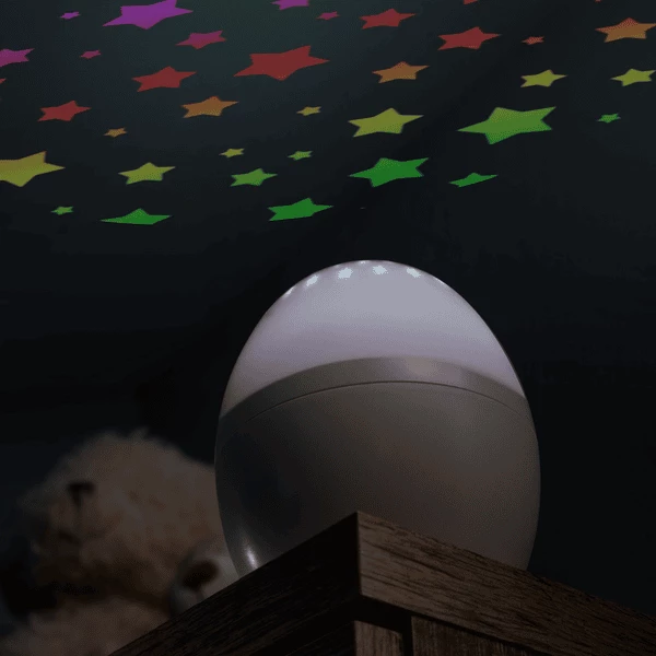 Starlino Proietta sul soffitto un motivo stellare calmante e immerge la camera dei bambini in un’atmosfera magica. Grazie al cambio automatico di colore, il cielo stellato viene delicatamente colorato di rosso, verde e blu. Se lo si desidera, la funzione di blocco può essere utilizzata anche per impostare il colore preferito del bambino. Grazie ai 3 diversi livelli di luminosità, l’intensità della proiezione delle stelle può anche essere regolata individualmente.