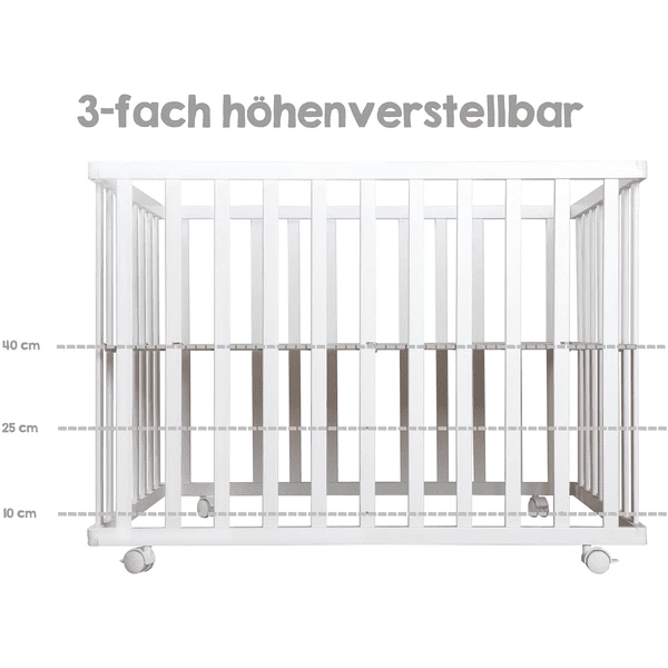 La possibilità di regolare il fondo con 3 altezza diverse, favorisce la schiena e invita i genitori a giocare con i loro piccoli. Con rotelle per semplificare gli spostamenti. Un posto sicuro in cui i bambini potranno scoprire, crescere ed imparare.