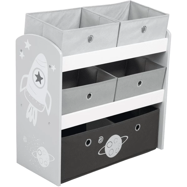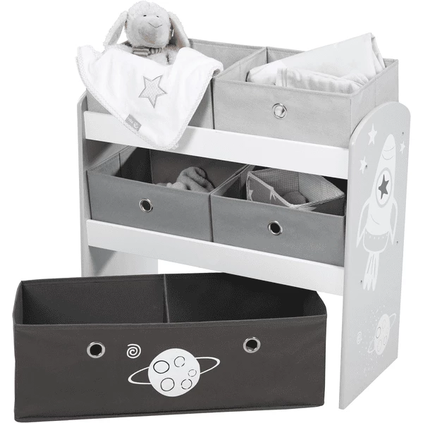 Con lo scaffale dei giochi anche i più piccoli imparano a mantenere l’ordine nella stanza dei bambini. Grazie alle grandi maniglie in metallo, le scatole in tessuto possono essere facilmente rimosse e riposte sul ripiano portagiocattoli. La scatola di tessuto più bassa e più grande è stampata con una stella, in corrispondenza del motivo di stampa sulle parti laterali del ripiano portaoggetti.