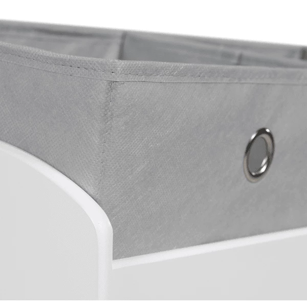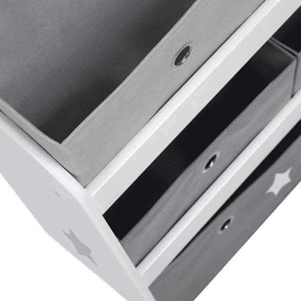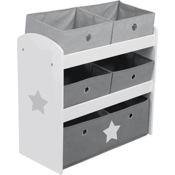 Grazie alle grandi maniglie in metallo, le scatole in tessuto possono essere facilmente rimosse e riposte sul ripiano portagiocattoli. La scatola di tessuto più bassa e più grande è stampata con una stella, in corrispondenza del motivo di stampa sulle parti laterali del ripiano portaoggetti. Con 5 scatole in tessuto (4 scatole da 30 x 24 x 15 cm), 1 scatola con le dimensioni 60 x 24 x 20 cm (LxLxPxA). Dimensioni totali dello scaffale: 63,5 x 30 x 60 cm (lunghezza x larghezza x altetta)