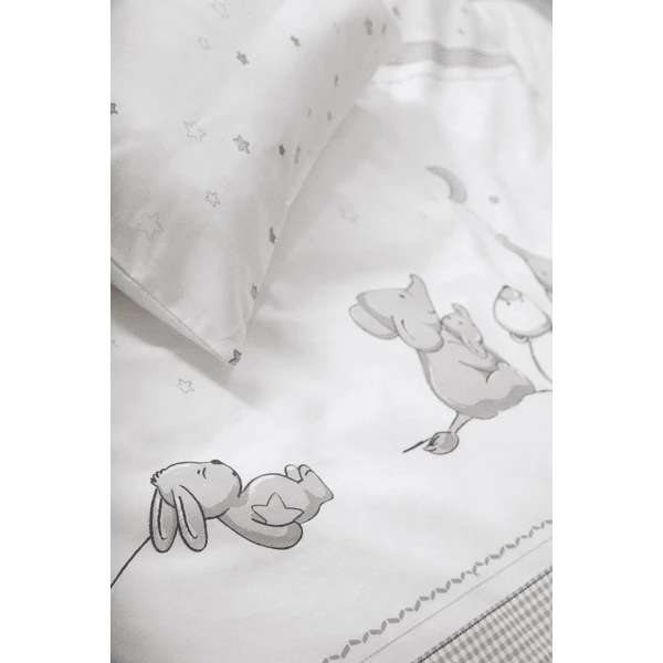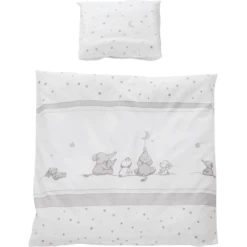 La biancheria è double face, comodissima per la cameretta. La pregiata biancheria da letto a culla in due pezzi è composta da un cuscino di 40 x 35 cm e da un copripiumino di 80 x 80 cm ed è realizzata in cotone traspirante e non irritante per la pelle.