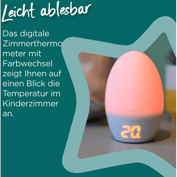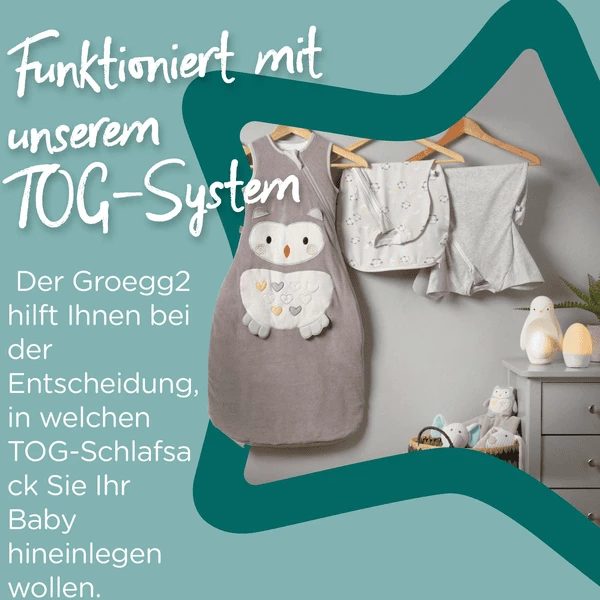 Il Groegg2 ti aiuta a decidere quale sacco nanna con quale valore TOG* è meglio per il tuo bambino. Questo assicura al tuo bambino un sonno riposante e sicuro. Il colore mostrato copre una gamma di temperature. Questa gamma di colori si riflette anche nell’etichettatura TOG della biancheria da letto e da notte di Tommee Tippee. Oltre all’innovativo sistema di cambio colore e all’indicazione della temperatura di Tommee Tippee, il GroEgg2 ha anche una funzione di oscuramento che permette di regolare la luminosità. Questo significa che può essere utilizzato anche come luce notturna.
